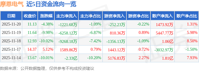 证券之星消息,截至2025年11月20日收盘,摩恩电气(002451)报收于11.13元,下跌4.38%,换手率22.88%,成交量100.49万手,成交额11.25亿元。