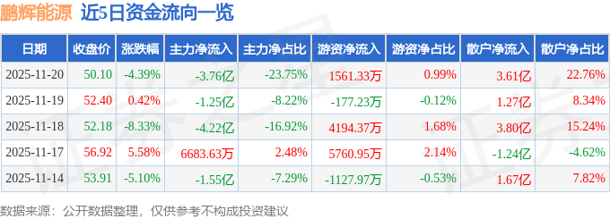 证券之星消息,截至2025年11月20日收盘,鹏辉能源(300438)报收于50.1元,下跌4.39%,换手率7.68%,成交量31.06万手,成交额15.84亿元。