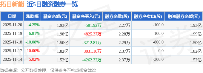 证券之星消息,截至2025年11月20日收盘,拓日新能(002218)报收于4.06元,下跌4.25%,换手率9.49%,成交量132.09万手,成交额5.45亿元。