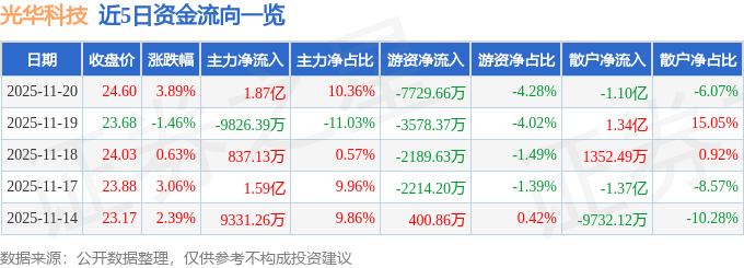 证券之星消息,截至2025年11月20日收盘,光华科技(002741)报收于24.6元,上涨3.89%,换手率16.78%,成交量71.55万手,成交额18.05亿元。