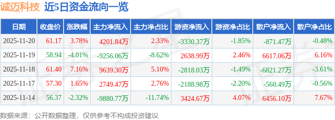 证券之星消息,截至2025年11月20日收盘,诚迈科技(300598)报收于61.17元,上涨3.78%,换手率13.49%,成交量29.27万手,成交额18.05亿元。