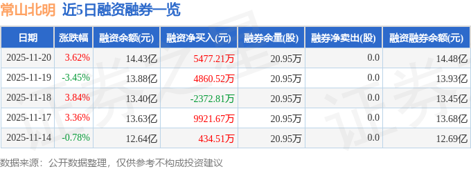 常山北明融资融券信息显示,融资方面,当日融资买入3.46亿元,融资偿还2.91亿元,融资净买入5477.21万元。融券方面,融券卖出0.0股,融券偿还0.0股,融券余量20.95万股,融券余额516.0万元。融资融券余额14.48亿元。