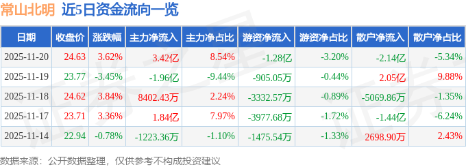 11月20日的资金流向数据方面,主力资金净流入3.42亿元,占总成交额8.54%,游资资金净流出1.28亿元,占总成交额3.2%,散户资金净流出2.14亿元,占总成交额5.34%。