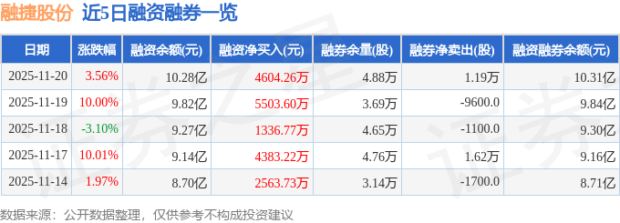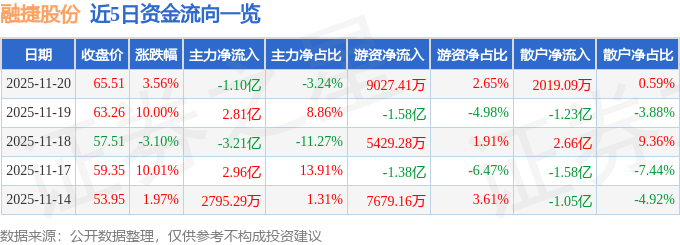 证券之星消息,截至2025年11月20日收盘,融捷股份(002192)报收于65.51元,上涨3.56%,换手率19.92%,成交量51.62万手,成交额34.1亿元。