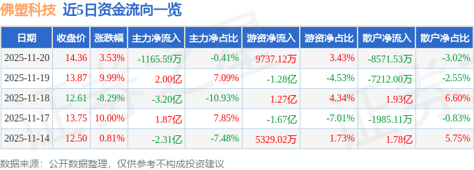 证券之星消息,截至2025年11月20日收盘,佛塑科技(000973)报收于14.36元,上涨3.53%,换手率20.27%,成交量196.08万手,成交额28.41亿元。