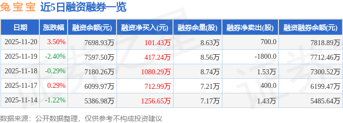 兔 宝 宝融资融券信息显示,融资方面,当日融资买入893.13万元,融资偿还791.7万元,融资净买入101.43万元,连续3日净买入累计1598.96万元。融券方面,融券卖出1300.0股,融券偿还600.0股,融券余量8.63万股,融券余额119.96万元。融资融券余额7818.89万元。