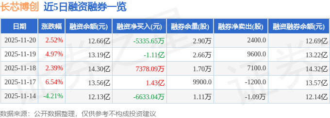长芯博创融资融券信息显示,融资方面,当日融资买入3.17亿元,融资偿还3.7亿元,融资净偿还5335.65万元。融券方面,融券卖出3100.0股,融券偿还700.0股,融券余量2.9万股,融券余额311.49万元。融资融券余额12.69亿元。