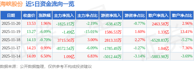 证券之星消息,截至2025年11月20日收盘,海峡股份(002320)报收于13.53元,上涨1.96%,换手率2.75%,成交量61.47万手,成交额8.32亿元。