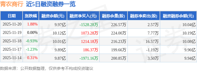 青农商行融资融券信息显示,融资方面,当日融资买入3637.24万元,融资偿还5165.52万元,融资净偿还1528.28万元。融券方面,融券卖出2.62万股,融券偿还500.0股,融券余量226.57万股,融券余额736.35万元。融资融券余额10.04亿元。