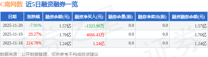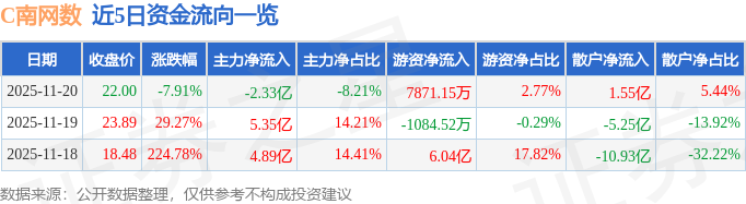 证券之星消息,截至2025年11月20日收盘,C南网数(301638)报收于22.0元,下跌7.91%,换手率53.4%,成交量125.49万手,成交额28.44亿元。