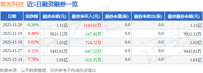 常友科技融资融券信息显示,融资方面,当日融资买入3453.07万元,融资偿还2309.46万元,融资净买入1143.61万元。融券方面,融券卖出0.0股,融券偿还0.0股,融券余量0.0股,融券余额0.0万元。融资融券余额1.11亿元。