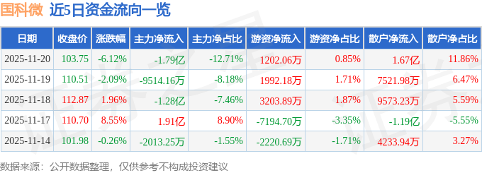 证券之星消息,截至2025年11月20日收盘,国科微(300672)报收于103.75元,下跌6.12%,换手率6.38%,成交量13.43万手,成交额14.1亿元。