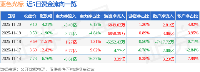 证券之星消息,截至2025年11月20日收盘,蓝色光标(300058)报收于9.1元,下跌4.21%,换手率17.68%,成交量615.17万手,成交额57.1亿元。