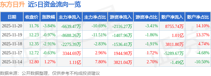 证券之星消息,截至2025年11月20日收盘,东方日升(300118)报收于11.76元,下跌3.84%,换手率5.6%,成交量51.9万手,成交额6.21亿元。