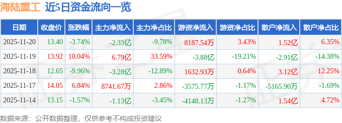 证券之星消息,截至2025年11月20日收盘,海陆重工(002255)报收于13.4元,下跌3.74%,换手率27.82%,成交量177.5万手,成交额23.87亿元。