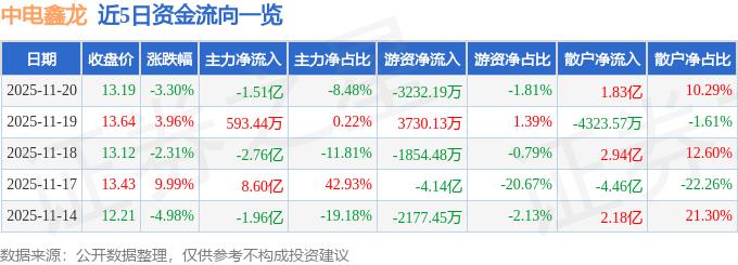 证券之星消息,截至2025年11月20日收盘,中电鑫龙(002298)报收于13.19元,下跌3.3%,换手率20.58%,成交量135.95万手,成交额17.82亿元。