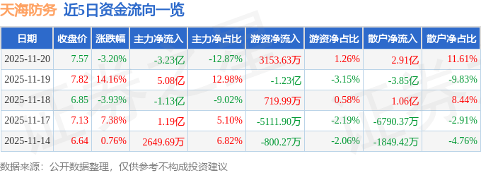 证券之星消息,截至2025年11月20日收盘,天海防务(300008)报收于7.57元,下跌3.2%,换手率20.05%,成交量330.24万手,成交额25.09亿元。