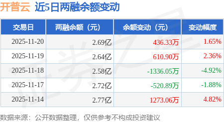 证券之星消息,11月20日,开普云(688228)融资买入1740.88万元,融资偿还1304.55万元,融资净买入436.33万元,融资余额2.69亿元。