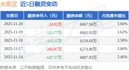 证券之星消息,11月20日,大宏立(300865)融资买入215.47万元,融资偿还191.45万元,融资净买入24.02万元,融资余额6067.94万元。