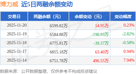 证券之星消息,11月20日,博力威(688345)融资买入541.27万元,融资偿还526.33万元,融资净买入14.95万元,融资余额6599.82万元,近20个交易日中有11个交易日出现融资净买入。