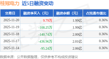 证券之星消息,11月20日,桂冠电力(600236)融资买入252.76万元,融资偿还242.96万元,融资净买入9.79万元,融资余额1.99亿元。