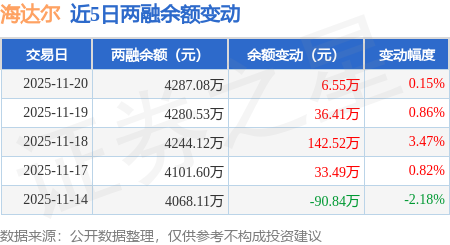 融资融券余额4287.08万元,较昨日上涨0.15%。