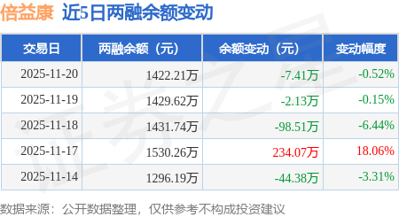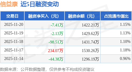 证券之星消息,11月20日,倍益康(920199)融资买入120.07万元,融资偿还127.48万元,融资净卖出7.41万元,融资余额1422.21万元。