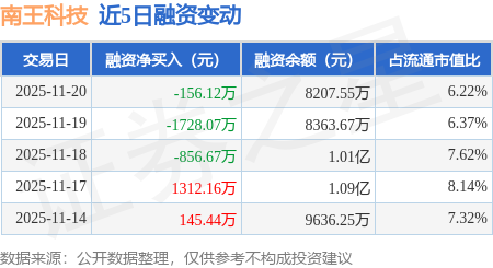 证券之星消息,11月20日,南王科技(301355)融资买入938.26万元,融资偿还1094.38万元,融资净卖出156.12万元,融资余额8207.55万元,近20个交易日中有11个交易日出现融资净买入。