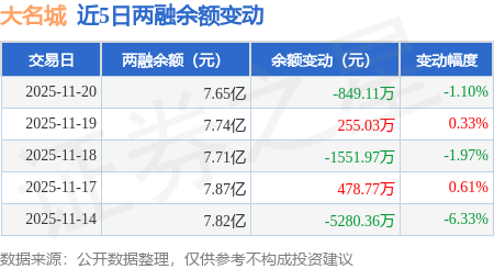 证券之星消息,11月20日,大名城(600094)融资买入1162.01万元,融资偿还1991.89万元,融资净卖出829.87万元,融资余额7.63亿元,近20个交易日中有11个交易日出现融资净买入。