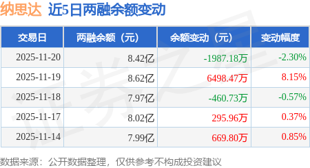 证券之星消息,11月20日,纳思达(002180)融资买入3637.39万元,融资偿还5583.89万元,融资净卖出1946.5万元,融资余额8.37亿元,近20个交易日中有12个交易日出现融资净买入。