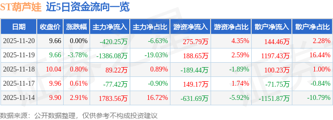 11月20日的资金流向数据方面,主力资金净流出420.25万元,占总成交额6.63%,游资资金净流入275.79万元,占总成交额4.35%,散户资金净流入144.46万元,占总成交额2.28%。