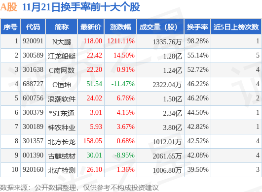 当日A股换手率前10大个股中8只个股收涨,平均涨幅155.39%,其中N大鹏(920091)以换手率98.28%排第一,7只个股近5个交易日中多次上榜。