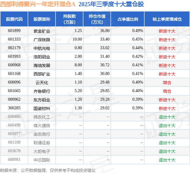 西部利得聚兴一年定开混合A的前十大重仓股如下: