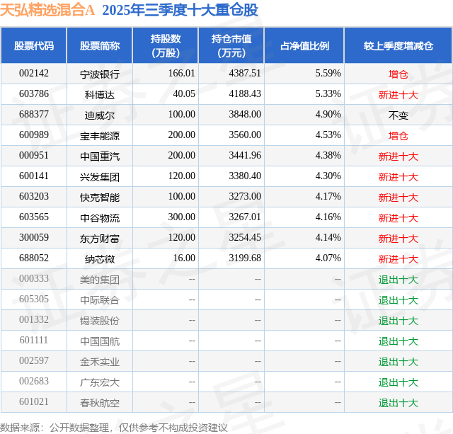 天弘精选混合A的前十大重仓股如下: