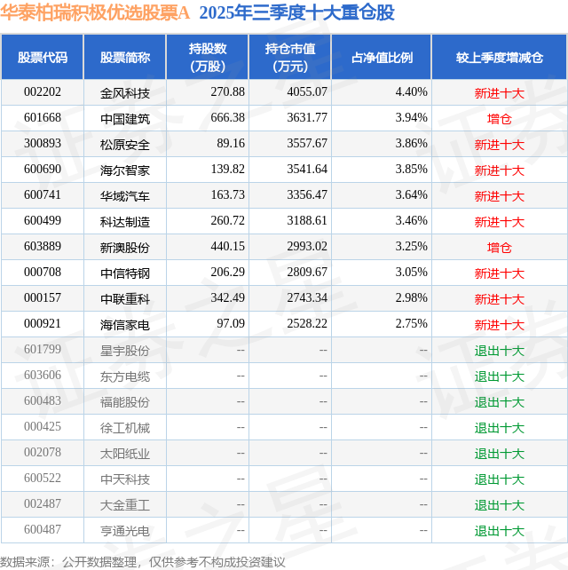 根据2025基金Q3季报公募基金重仓股数据,重仓该股的公募基金共7家,其中持有数量最多的公募基金为华泰柏瑞基金的华泰柏瑞积极优选股票A。华泰柏瑞积极优选股票A目前规模为2.69亿元,最新净值1.396(11月20日),较上一交易日下跌0.21%,近一年上涨24.87%。该公募基金现任基金经理为王林军。王林军在任的基金产品包括:华泰柏瑞成长智选混合A,管理时间为2024年8月2日至今,期间收益率为52.14%;华泰柏瑞制造业主题混合A,管理时间为2025年9月30日至今,期间收益率为0.09%。