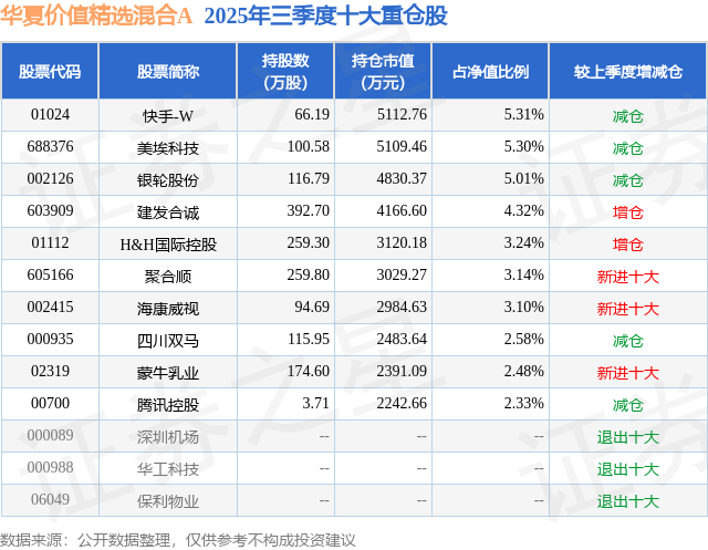 根据2025基金Q3季报公募基金重仓股数据,重仓该股的公募基金共9家,其中持有数量最多的公募基金为华夏基金的华夏价值精选混合A。华夏价值精选混合A目前规模为9.64亿元,最新净值1.9005(11月20日),较上一交易日下跌0.22%,近一年上涨40.73%。该公募基金现任基金经理为朱熠。朱熠在任的基金产品包括:华夏兴夏价值一年持有混合发起式A,管理时间为2023年5月5日至今,期间收益率为45.74%;华夏红利价值混合A,管理时间为2025年8月12日至今,期间收益率为7.76%。
