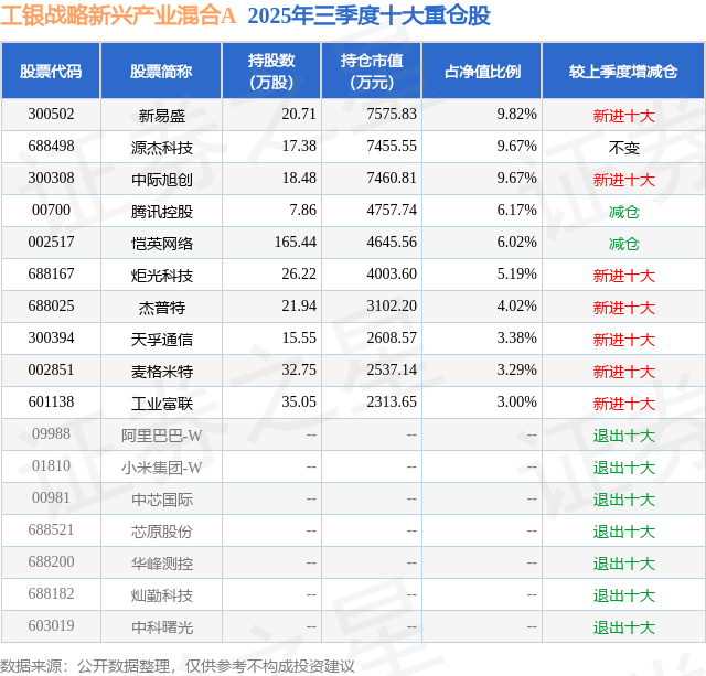 根据2025基金Q3季报公募基金重仓股数据,重仓该股的公募基金共10家,其中持有数量最多的公募基金为工银瑞信基金的工银战略新兴产业混合A。工银战略新兴产业混合A目前规模为5.88亿元,最新净值2.7957(11月20日),较上一交易日下跌0.04%,近一年上涨56.3%。该公募基金现任基金经理为夏雨 马丽娜。夏雨在任的基金产品包括:工银创业板两年定开混合A,管理时间为2021年4月2日至今,期间收益率为5.48%;工银科技创新6个月定开混合A,管理时间为2021年12月7日至今,期间收益率为-4.42%。马丽娜在任的基金产品包括:工银创新精选一年定开混合A,管理时间为2022年3月7日至今,期间收益率为43.08%;工银新兴制造混合A,管理时间为2024年7月8日至今,期间收益率为121.61%;工银科技先锋混合发起式A,管理时间为2025年7月15日至今,期间收益率为33.52%。