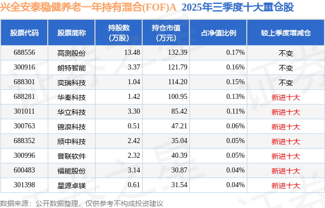 根据2025基金Q3季报公募基金重仓股数据,重仓该股的公募基金共1家,其中持有数量最多的公募基金为兴证全球基金的兴全安泰稳健养老一年持有混合(FOF)A。兴全安泰稳健养老一年持有混合(FOF)A目前规模为6.59亿元,最新净值1.195(11月18日),较上一交易日下跌0.21%,近一年上涨9.06%。该公募基金现任基金经理为刘潇。刘潇在任的基金产品包括:兴证全球安悦平衡养老三年持有混合(FOF)A,管理时间为2022年12月20日至今,期间收益率为17.69%;兴证全球优选稳健六个月持有债券(FOF)A,管理时间为2024年5月16日至今,期间收益率为6.92%;兴证全球盈丰多元配置三个月持有混合(ETF-FOF)A,管理时间为2025年9月9日至今,期间收益率为1.44%。