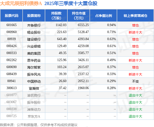 大成元辰招利债券A的前十大重仓股如下: