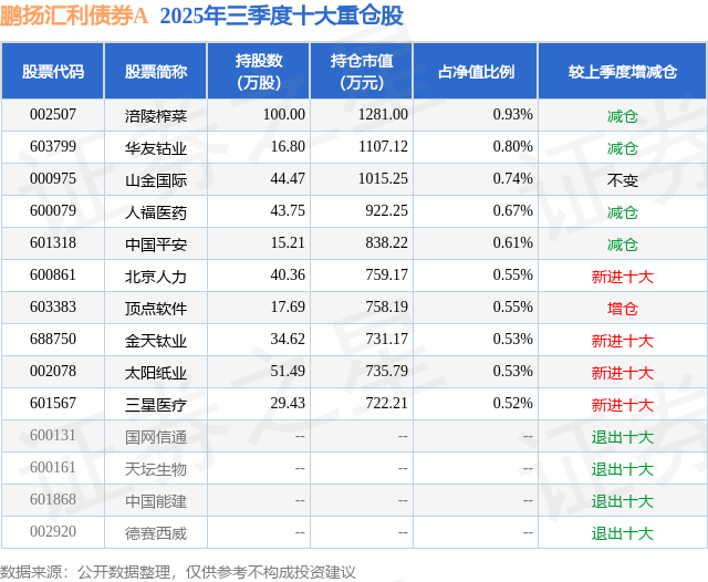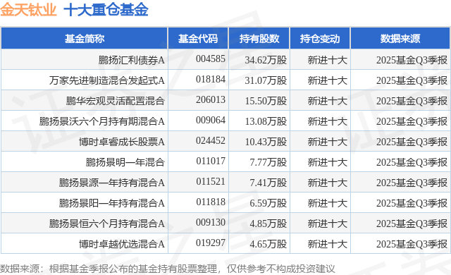 根据2025基金Q3季报公募基金重仓股数据,重仓该股的公募基金共12家,其中持有数量最多的公募基金为鹏扬基金的鹏扬汇利债券A。鹏扬汇利债券A目前规模为12.09亿元,最新净值1.1702(11月20日),较上一交易日下跌0.08%,近一年上涨4.35%。该公募基金现任基金经理为杨爱斌 焦翠。杨爱斌在任的基金产品包括:鹏扬泓利债券A,管理时间为2018年12月12日至今,期间收益率为31.41%;鹏扬景沣六个月持有期混合A,管理时间为2020年8月11日至今,期间收益率为19.04%;鹏扬聚利六个月持有期债券A,管理时间为2021年7月1日至今,期间收益率为9.18%。焦翠在任的基金产品包括:鹏扬景兴混合A,管理时间为2018年3月16日至今,期间收益率为68.23%;鹏扬利泽债券A,管理时间为2018年8月23日至今,期间收益率为23.59%;鹏扬淳熙一年定开债发起式,管理时间为2021年8月18日至今,期间收益率为18.34%。