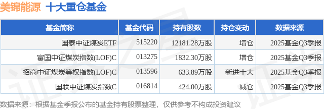 根据2025基金Q3季报公募基金重仓股数据,重仓该股的公募基金共4家,其中持有数量最多的公募基金为国泰基金的国泰中证煤炭ETF。国泰中证煤炭ETF目前规模为114.13亿元,最新净值1.1647(11月20日),较上一交易日下跌2.37%,近一年下跌0.8%。该公募基金现任基金经理为吴中昊。吴中昊在任的基金产品包括:国泰中证500指数增强A,管理时间为2022年1月28日至今,期间收益率为23.88%;国泰中证内地运输主题ETF,管理时间为2022年11月30日至今,期间收益率为-1.68%;国泰沪深300指数增强A,管理时间为2022年12月30日至今,期间收益率为17.09%;国泰国证新能源汽车指数C,管理时间为2022年12月30日至今,期间收益率为17.51%。