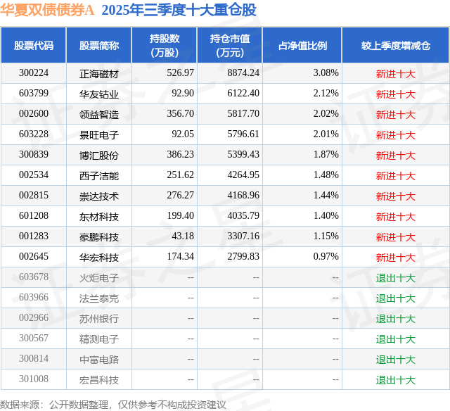 根据2025基金Q3季报公募基金重仓股数据,重仓该股的公募基金共15家,其中持有数量最多的公募基金为华夏基金的华夏双债债券A。华夏双债债券A目前规模为19.09亿元,最新净值2.051(11月20日),较上一交易日下跌0.18%,近一年上涨16.57%。该公募基金现任基金经理为柳万军。柳万军在任的基金产品包括:华夏纯债债券A,管理时间为2017年9月8日至今,期间收益率为36.36%;华夏永康添福混合A,管理时间为2019年7月15日至今,期间收益率为74.24%;华夏鼎清债券A,管理时间为2020年12月3日至今,期间收益率为16.72%。
