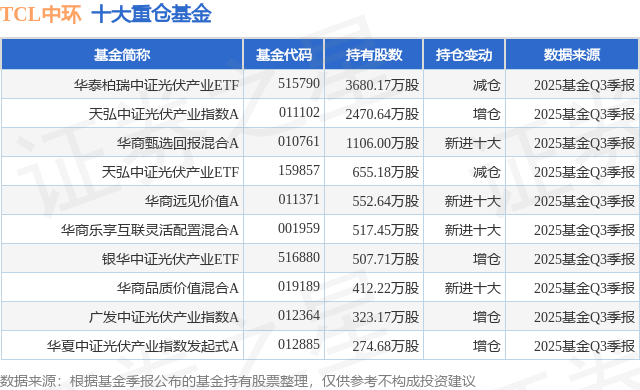 根据2025基金Q3季报公募基金重仓股数据,重仓该股的公募基金共27家,其中持有数量最多的公募基金为华泰柏瑞基金的华泰柏瑞中证光伏产业ETF。华泰柏瑞中证光伏产业ETF目前规模为139.76亿元,最新净值0.9826(11月20日),较上一交易日下跌1.89%,近一年上涨15.34%。该公募基金现任基金经理为李茜 李沐阳。李茜在任的基金产品包括:华泰柏瑞上证红利ETF,管理时间为2019年11月5日至今,期间收益率为54.75%;华泰柏瑞中证港股通50ETF,管理时间为2020年12月30日至今,期间收益率为17.24%;华泰柏瑞中证物联网主题ETF,管理时间为2021年3月31日至今,期间收益率为31.76%。李沐阳在任的基金产品包括:华泰柏瑞光伏ETF联接A,管理时间为2021年8月17日至今,期间收益率为-38.66%;华泰柏瑞中韩半导体ETF(QDII),管理时间为2022年11月2日至今,期间收益率为134.11%;华泰柏瑞纳斯达克100ETF(QDII),管理时间为2023年3月1日至今,期间收益率为99.85%。