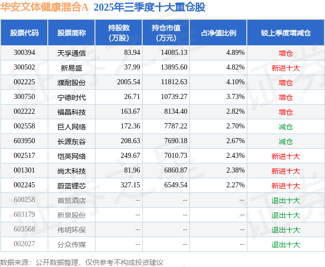 华安文体健康混合A的前十大重仓股如下:
