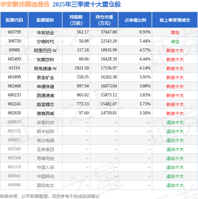 华安聚优精选混合的前十大重仓股如下: