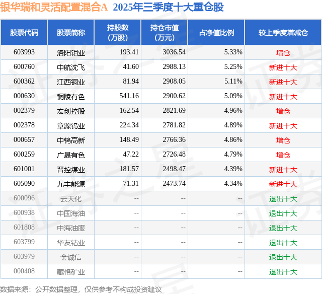 银华瑞和灵活配置混合A的前十大重仓股如下: