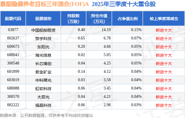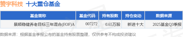 根据2025基金Q3季报公募基金重仓股数据,重仓该股的公募基金共1家,其中持有数量最多的公募基金为景顺长城基金的景顺稳健养老目标三年混合(FOF)A。景顺稳健养老目标三年混合(FOF)A目前规模为0.73亿元,最新净值1.2843(11月18日),较上一交易日下跌0.62%,近一年上涨12.57%。该公募基金现任基金经理为薛显志。