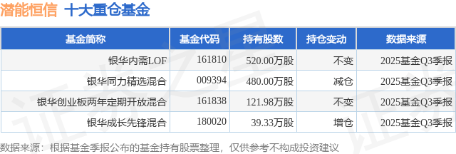 根据2025基金Q3季报公募基金重仓股数据,重仓该股的公募基金共4家,其中持有数量最多的公募基金为银华基金的银华内需LOF。银华内需LOF目前规模为17.2亿元,最新净值3.789(11月20日),较上一交易日下跌0.86%,近一年上涨46.97%。该公募基金现任基金经理为刘辉 王利刚。刘辉在任的基金产品包括:银华同力精选混合,管理时间为2020年6月16日至今,期间收益率为22.16%;银华创业板两年定期开放混合,管理时间为2020年8月7日至今,期间收益率为-22.45%。王利刚在任的基金产品包括:银华成长先锋混合,管理时间为2019年12月31日至今,期间收益率为19.92%;银华创业板两年定期开放混合,管理时间为2020年8月7日至今,期间收益率为-22.45%;银华同力精选混合,管理时间为2021年4月26日至今,期间收益率为23.37%;