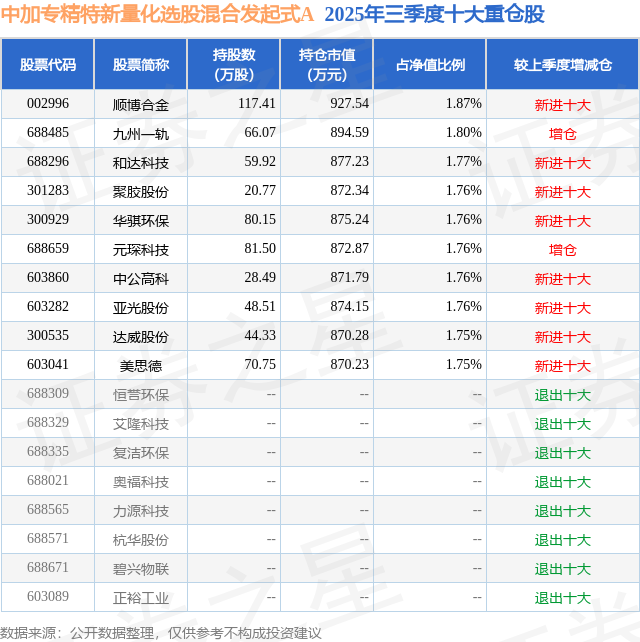 中加专精特新量化选股混合发起式A的前十大重仓股如下: