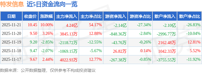 证券之星消息,截至2025年11月21日收盘,特发信息(000070)报收于10.45元,上涨10.0%,涨停,换手率8.57%,成交量76.19万手,成交额7.83亿元。